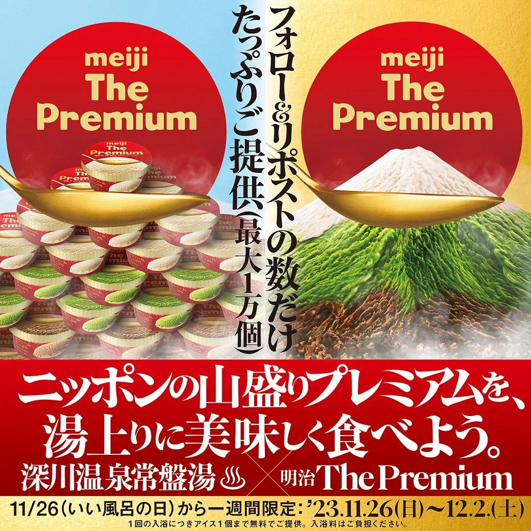 期間中に常盤湯で配布する「明治 The Premium」の個数は、11 月19 日(日)よりX(旧Twitter)のThe Premium アカウント(ID:@meiji_prmice)で行われるフォロー&リポストキャンペーンの結果で決定し、6 日間で最大1 万個の配布を予定しています。是非この機に、冬の湯上りの楽しみ方として、「明治The Premium」での「雪どけプレミアムな食べ方」をお試しください。