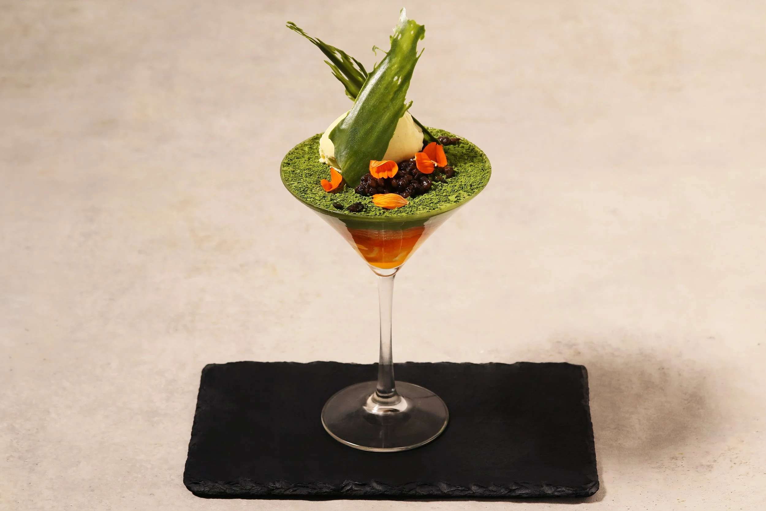 夜のおやつに、〆パフェにもピッタリなパフェです。本展では「新版画」を扱うことから、「和」の食材として人気の抹茶を中心に考えました。パフェに刺さっている抹茶チョコは、版画を制作する工程である「刷り跡」や何度も刷るという「重なり」を表現しています。緑とのコントラストが見た目にも美しいオレンジは、本展のテーマカラーである「夕焼けオレンジ」でもあります。さっぱりしたソースなので、飽きずに最後までお楽しみいただけます。