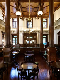 明治期(1894 年)に銀行営業室として利用された空間を復元したミュージアムカフェ・バー。クラシックな趣と、2層吹き抜けの高い天井が人気のお店です。