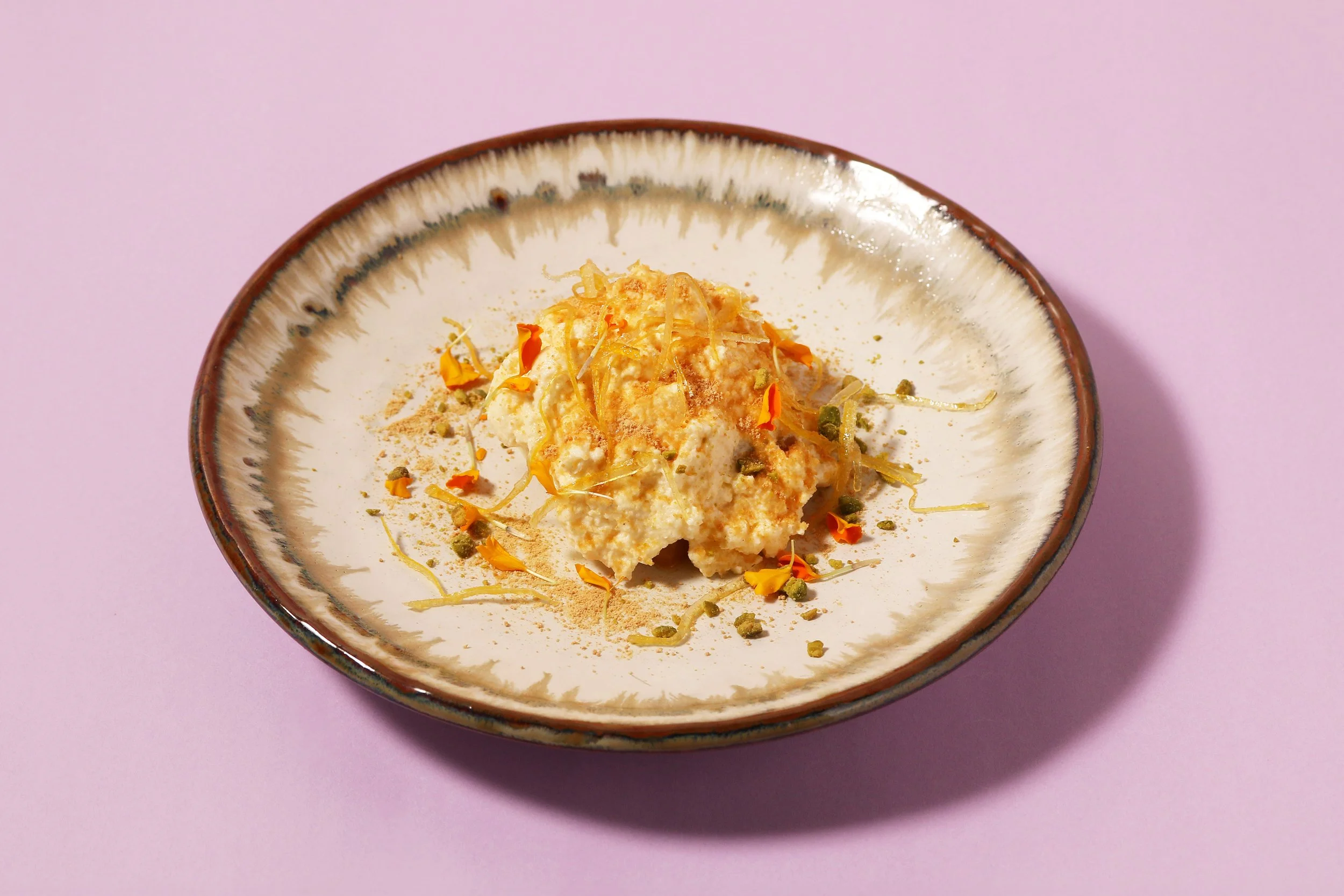 ほうじ茶を用いて和のテイストを取り入れ、固めの口あたりに仕上げました。フロマージュチーズのクリームをアクセントに添えましたので、味の変化もお楽しみいただけます。