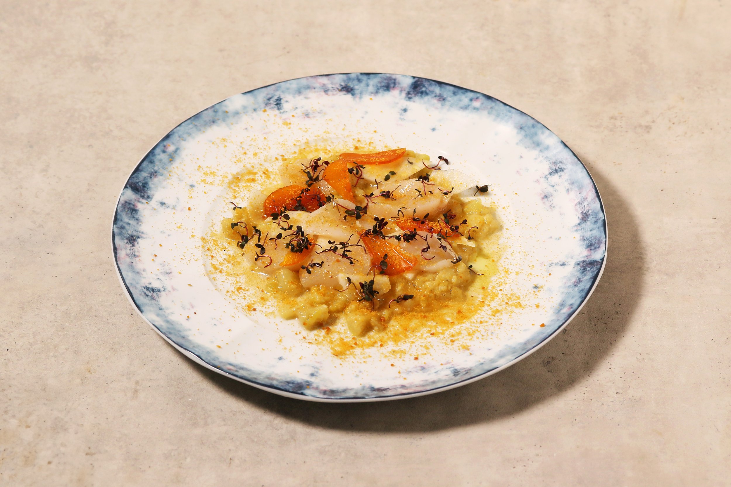 親しみのある「西京焼き」を再解釈した一皿です。柚子のさわやかなソースには、白みそを隠し味として加えました。シャキシャキとしたスプラウトとオレンジピールの存在が、この西京焼きの美味しさを引き出してくれるはずです。