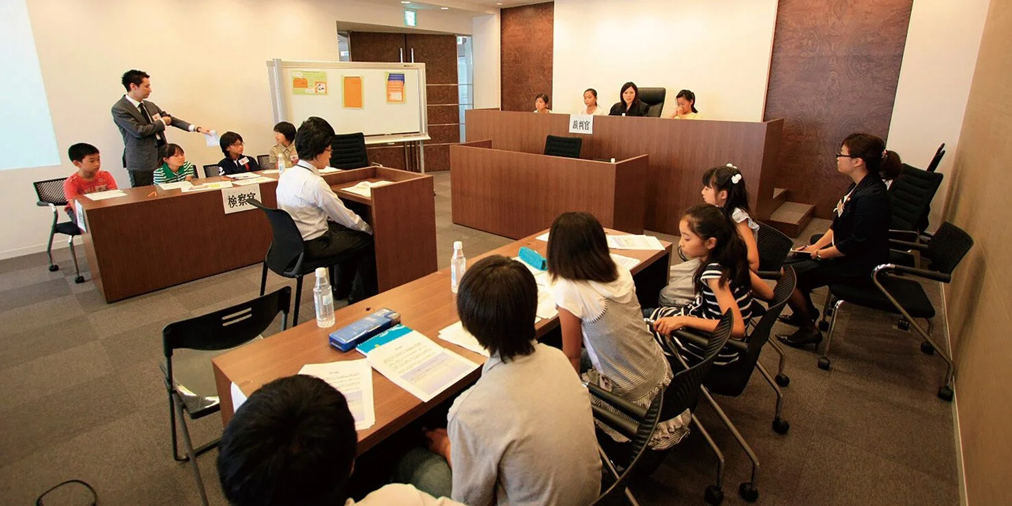 TMI 総合法律事務所に所属する弁護士の指導のもと事務所内の模擬法廷スペースで模擬裁判(刑事)を体験。裁判の仕組み・役割や法律・正義などの概念を考えるきっかけになることを目指し、“考えるチカラ”を育てます。