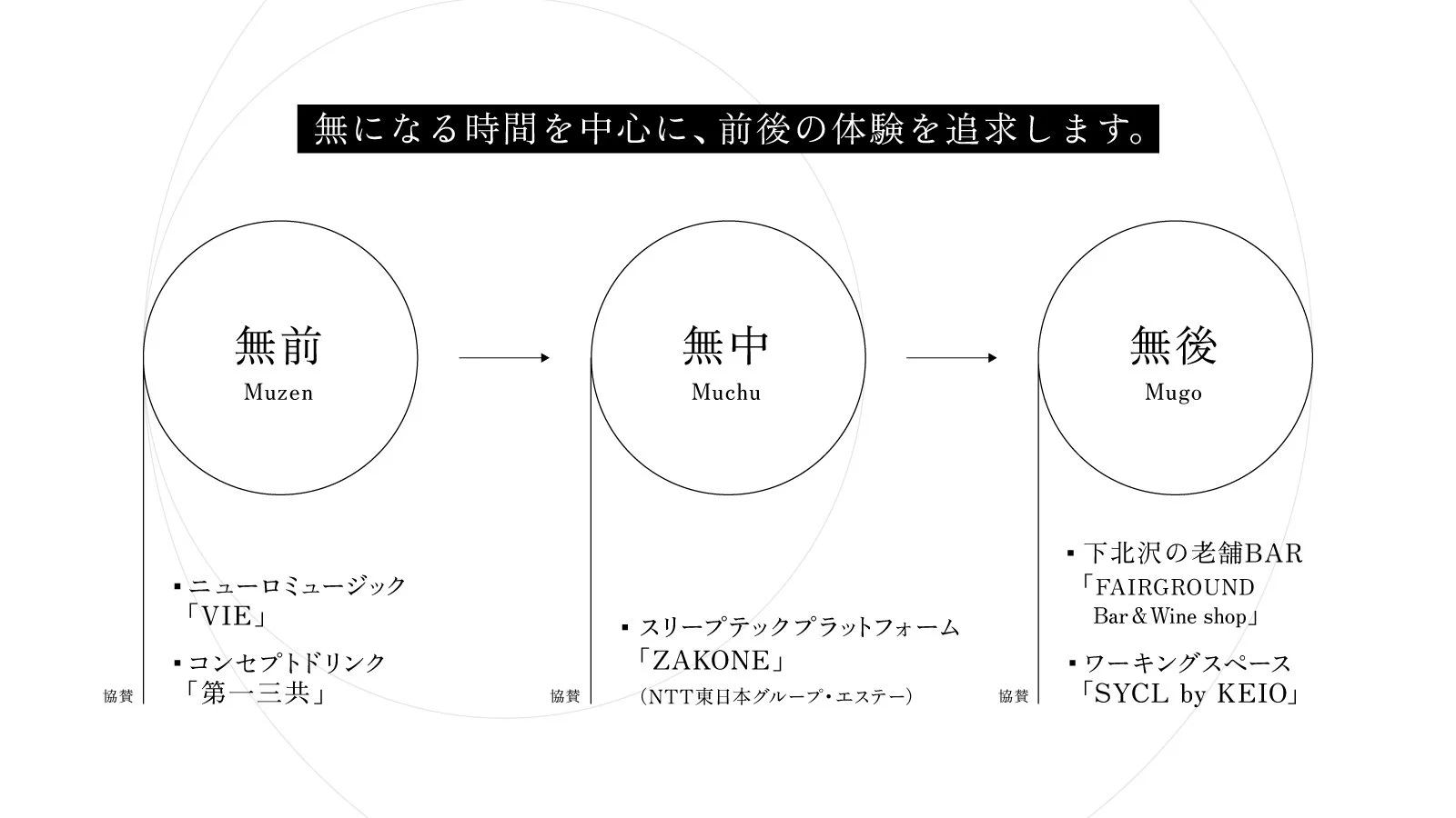 茶香(吸うお茶)、VIE Tunes(ニューロミュージック)、ZZZN NATURE(バーチャル森林浴)など先進企業とのコラボレーションにより、「無前」「無中」「無後」の新コンセプトを開発。
