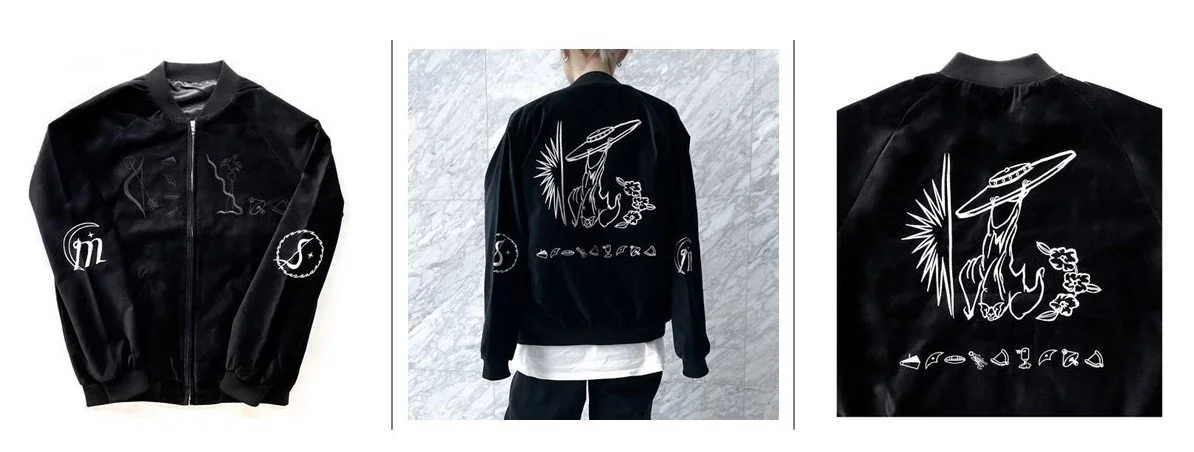 スカジャンの為の描き下ろしたドローイング作品を、別珍素材のオールブラックのスカジャンの胸、肘、背中に刺繍で表現。2021年制作。