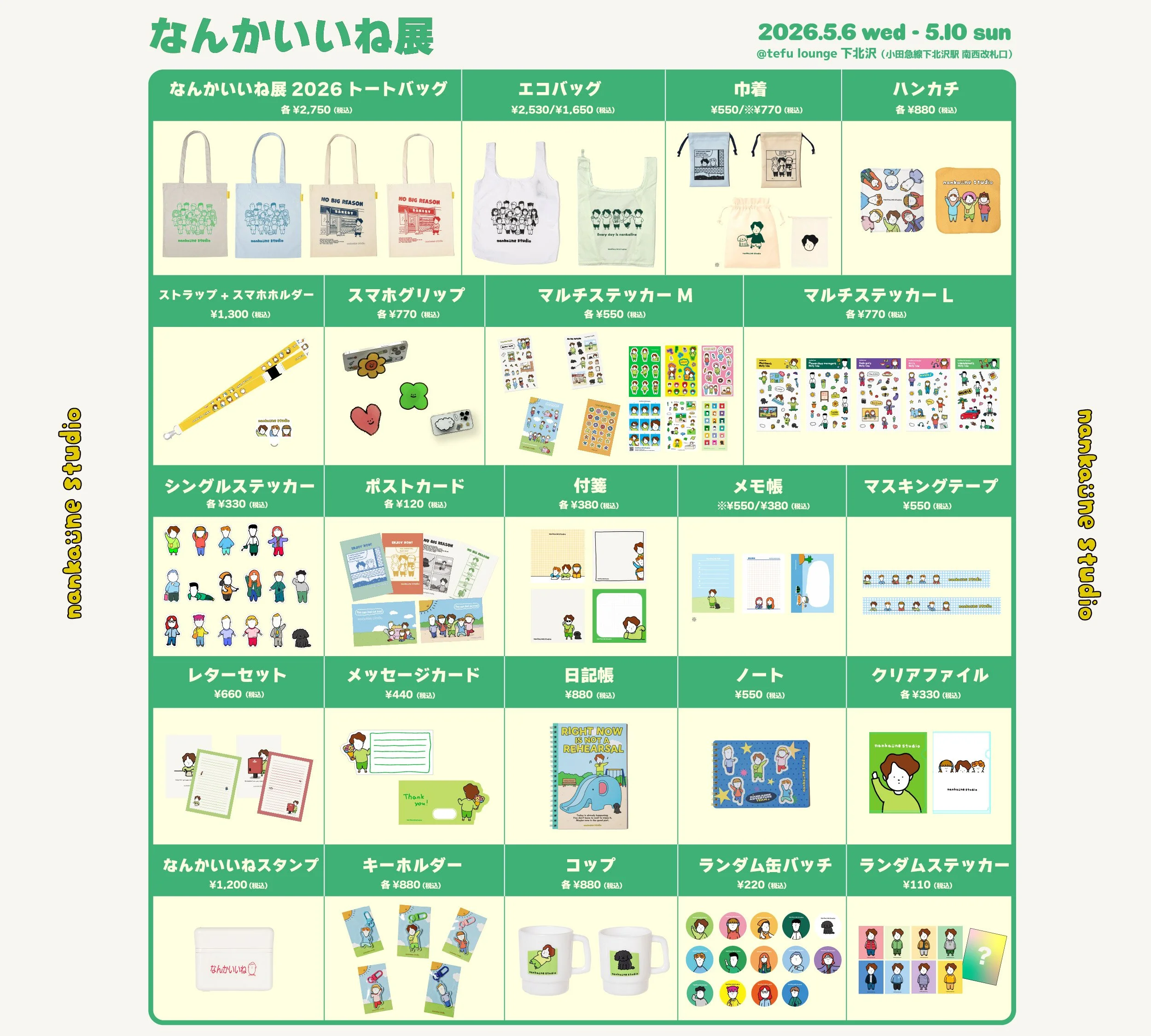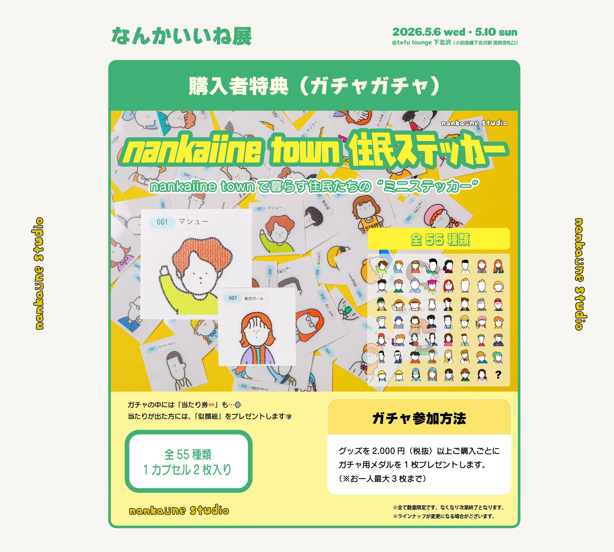 nankaiine studioの世界観をまるごと体感できる「なんかいいね展」が、2026年5月6日〜10日に下北沢・tefu loungeで開催。限定グッズやキャラクターガチャ、来場者プレゼントも。入場無料で気軽に立ち寄れます。