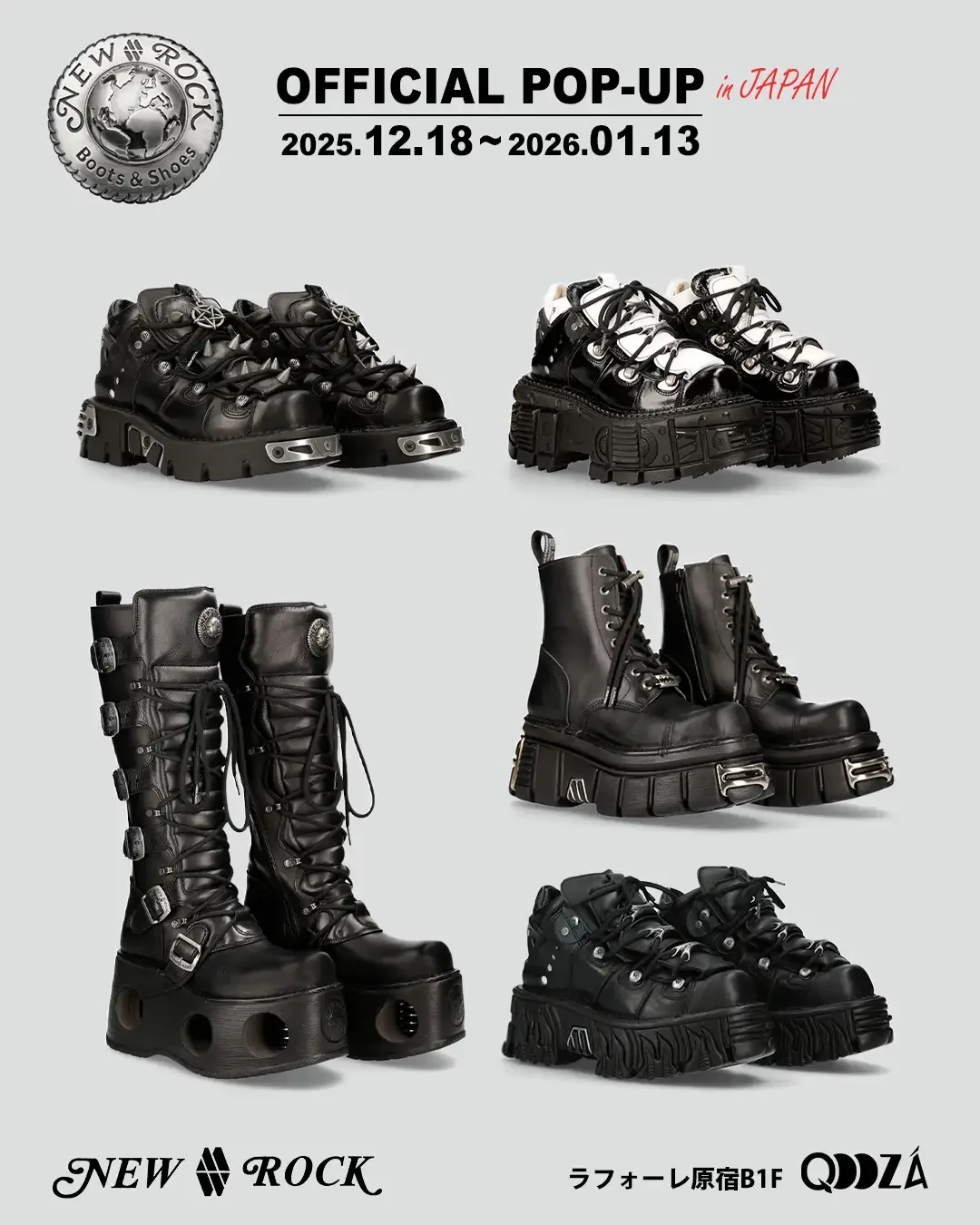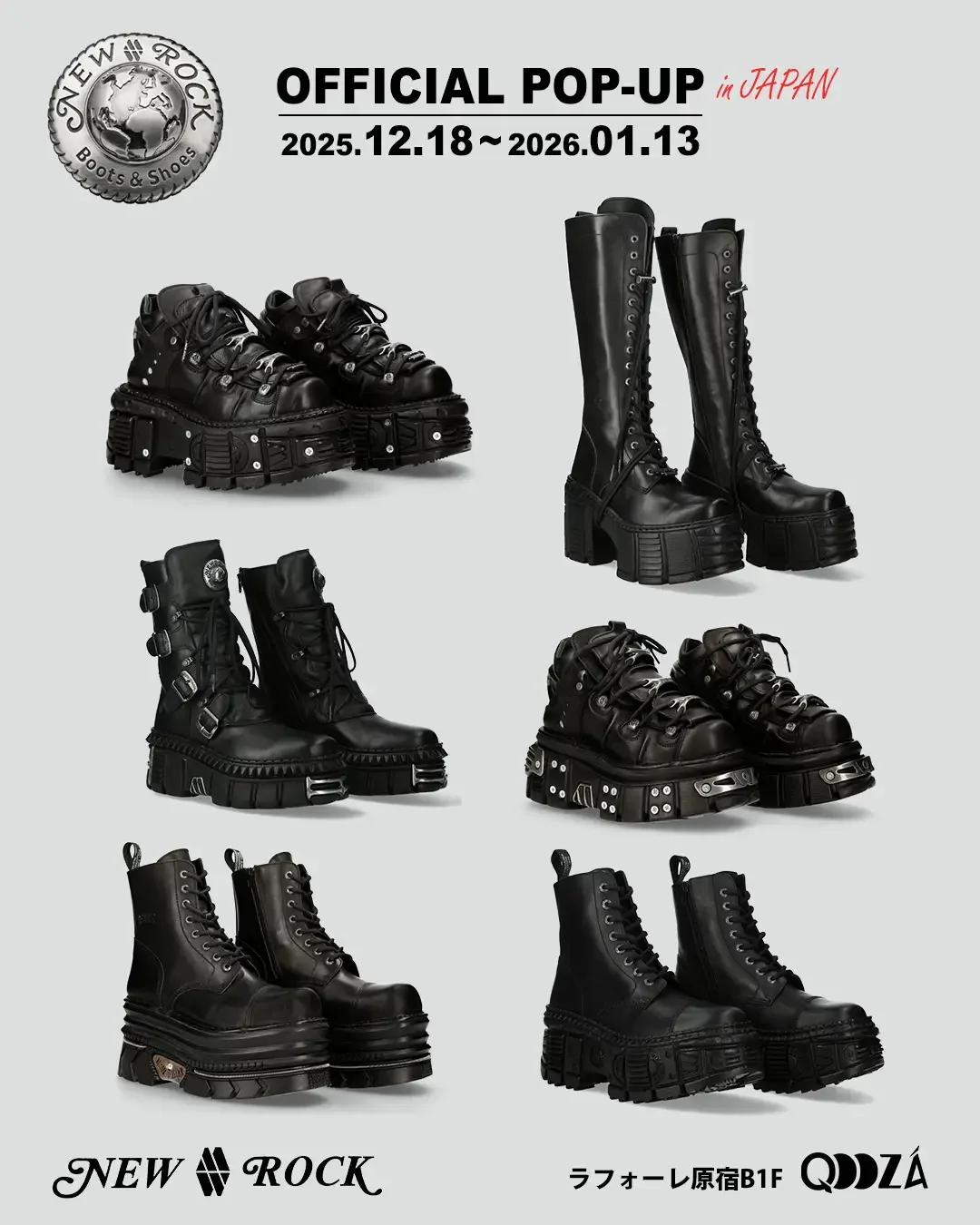 ゴシック、パンク、サイバー、そしてダークファッション。 世界中で人気を誇る足元から支え続けてきたNEW ROCKの重厚なDNAが、ラフォーレ原宿「QOOZA」でポップアップを開催。廃墟のようなインダストリアルな空間演出と、まるで兵器のような存在感を放つブーツの群れ。 単なる「買い物」ではなく、NEW ROCKという「力」を装備するための空間を創り上げました。
