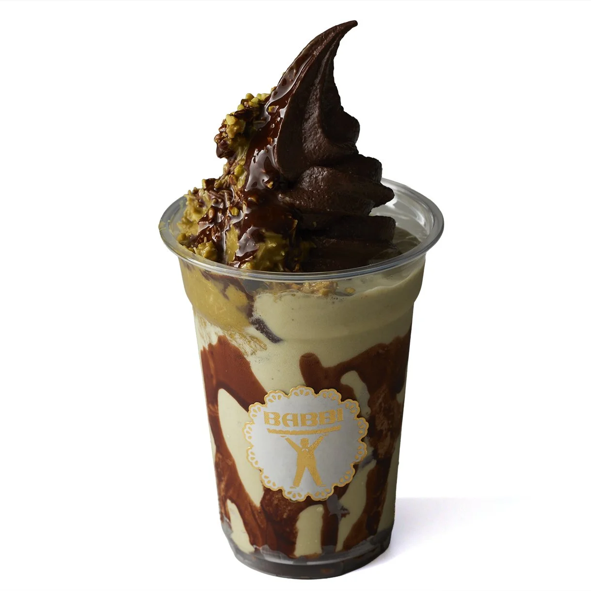香ばしいピスタチオと濃厚なチョコレートのソフトジェラートに、ザクザクとしたカダイフとウエハースの食感が楽しいうまみたっぷりのピスタチオソースと、ローストピスタチオ、パリパリ食感のチョコレートをトッピングしました。