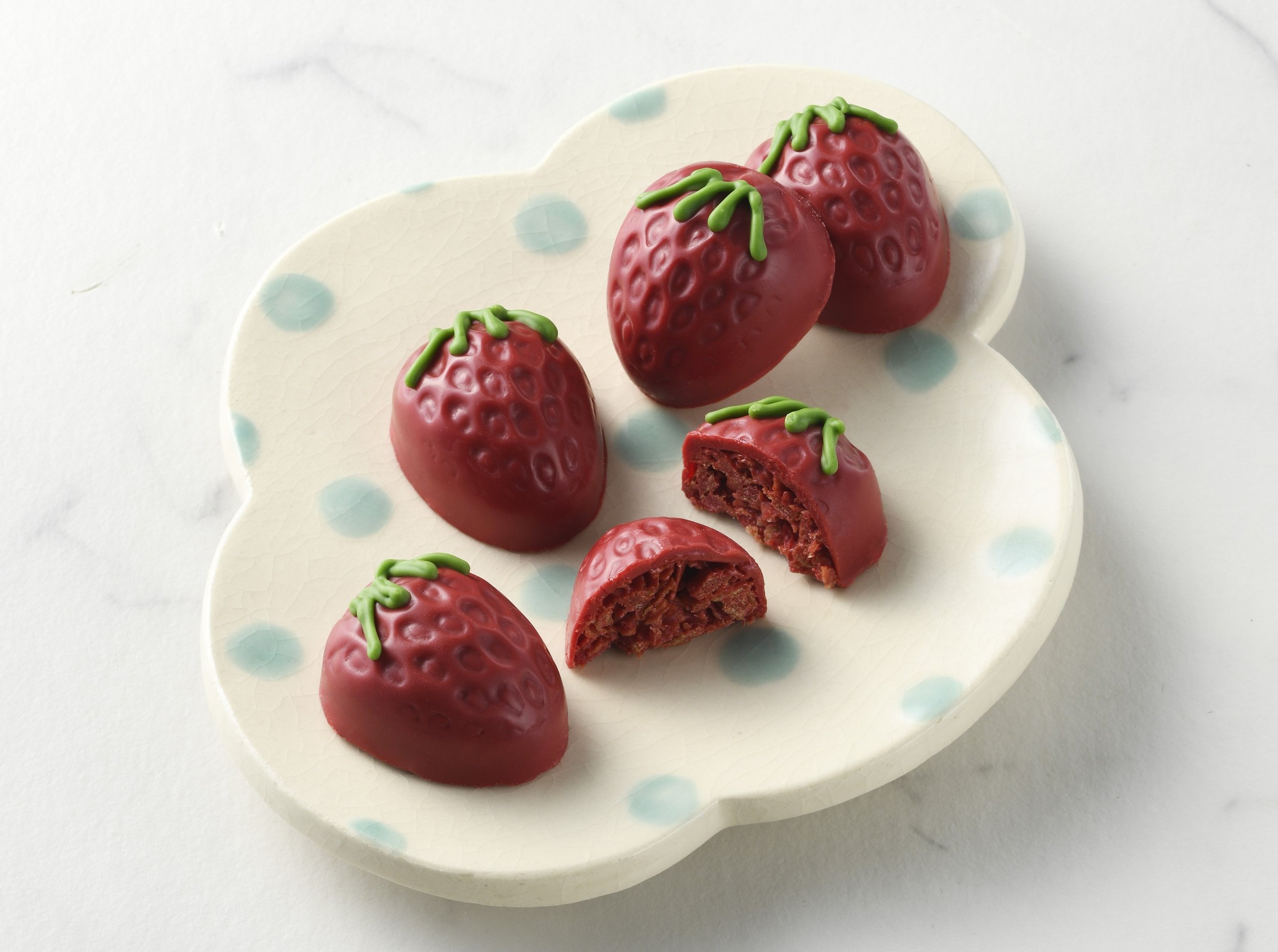 どこから見ても“いちご”の「いちごのチョコクランチ」。いちごを練り込んだホワイトチョコレートと、ザクザク食感のフィアンティーヌを、1対1で混ぜ込むことで、甘酸っぱさやフレッシュ感を再現。ビジュアルと美味しさで2度うれしいチョコレート!
