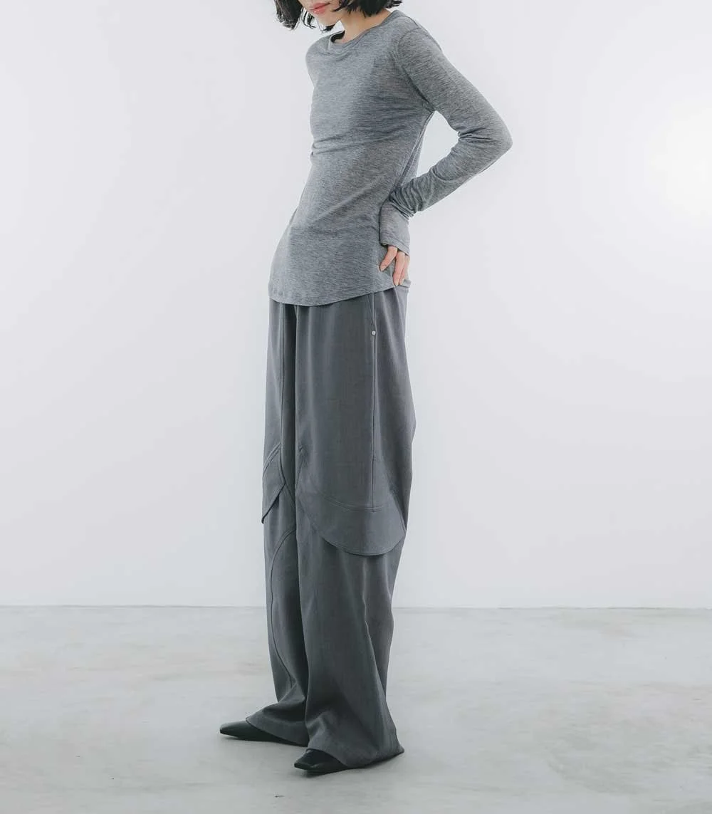 ウェービーな切り替えが目を引くデザイン性の高いイージースラックス。肌触りが良くきれいな表面感を持ち合わせた、ストレッチ性のあるのツイル素材を使用したパンツ。しっかりとした肉感があるため身体のラインを拾いにくく、ノンストレスな履き心地が魅力です。カーブラインは履いた時のレッグラインが綺麗に見えるように計算されたパターン設計に拘っています。