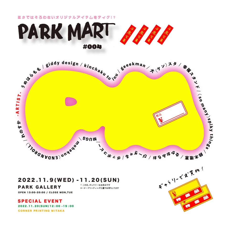 東京・末広町の PARK GALLERY では、2022年11月9日(水)より、さまざまなアーティストによる「オリジナルグッズ」に着目した展示・販売イベント『PARK MART #004』を開催します。