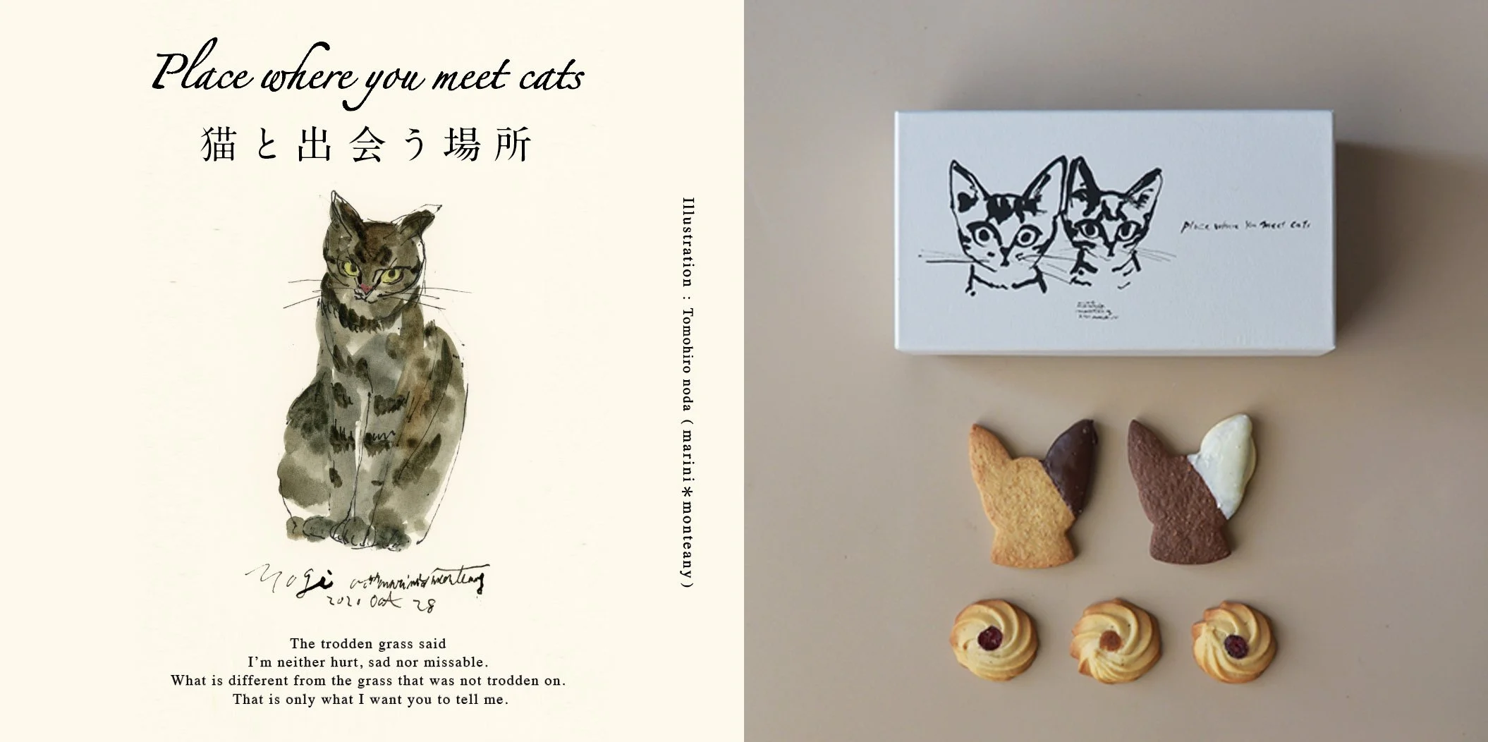 埼玉県東大宮にある人気の洋菓子店「PAS DE DEUX(パドゥドゥ)」とコラボレーションしたオリジナルクッキー。本年は『マリーニ*モンティー二の猫展』を記念して、保護猫のドローイング作品が描かれたオリジナルボックス付きクッキーを新発売。素材にこだわり丁寧に焼きあげた人気のクッキーは、売りあげの10%が熊本県の保護動物の譲渡会を運営している「ジョートフル熊本プロジェクト」へ寄付されます。