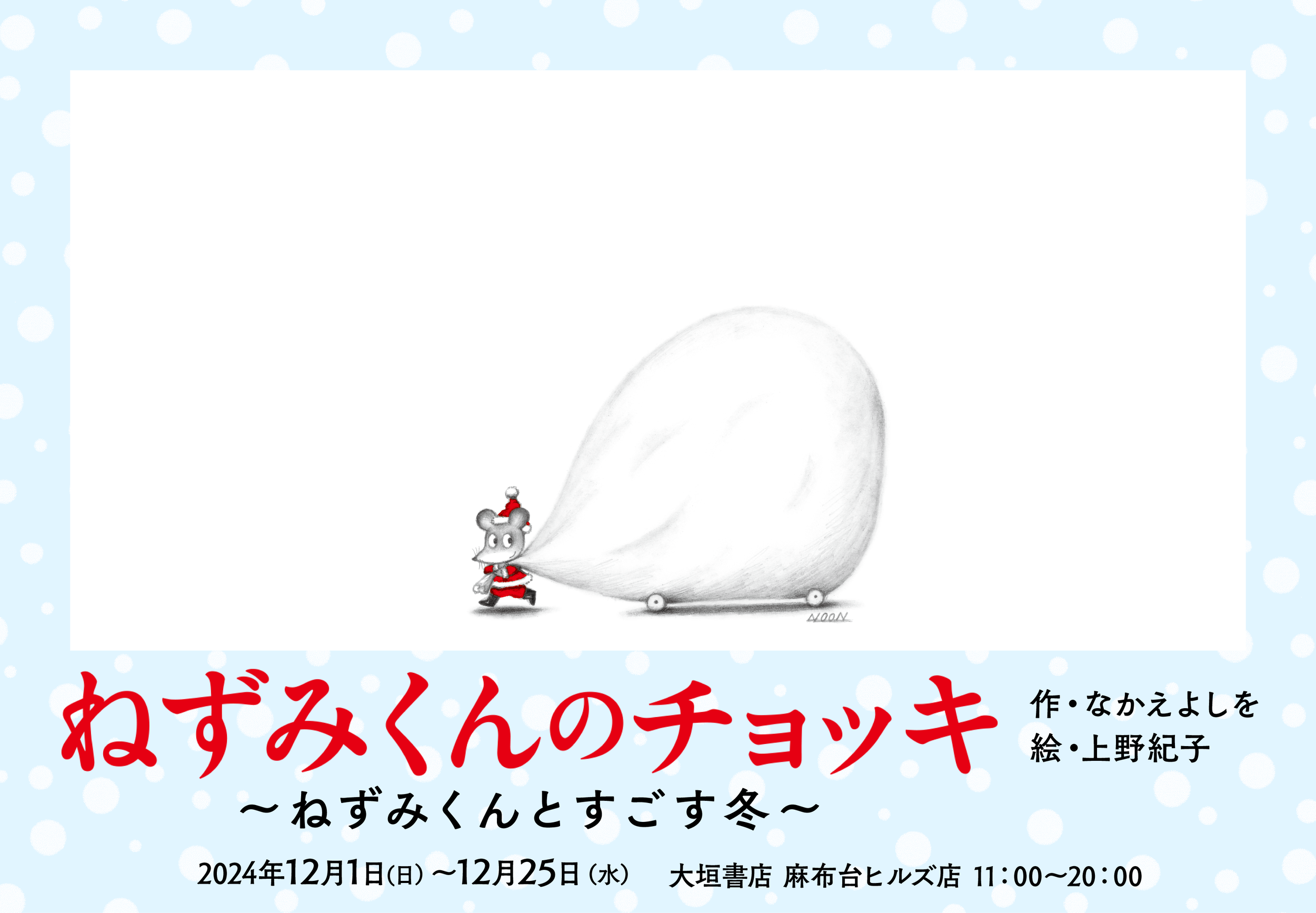 株式会社ポプラ社より1974年に刊行され、世代を超えて世界中で愛されてきた「ねずみくんの絵本」シリーズは、今年で誕生50周年を迎えました。これを記念して、「ねずみくんの冬」にフォーカスしたイベントを12月1日(日)から大垣書店麻布台ヒルズ店にて開催! 絵本未収録の原画・複製原画の展示や作者・なかえよしをさんによるクリスマススペシャルトーク&サイン会、クリスマスマーケットなど、本イベントでしか体験できない貴重な企画が盛りだくさんです!