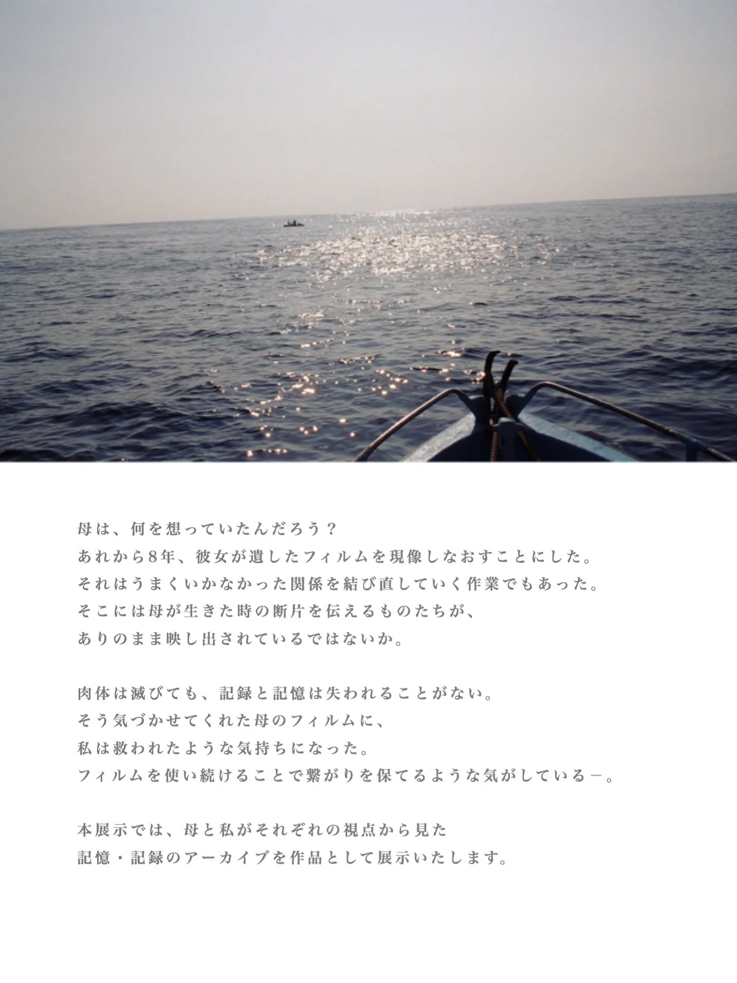 本展示では、母と私がそれぞれの視点から見た記憶・記録のアーカイブを作品として展示いたします。