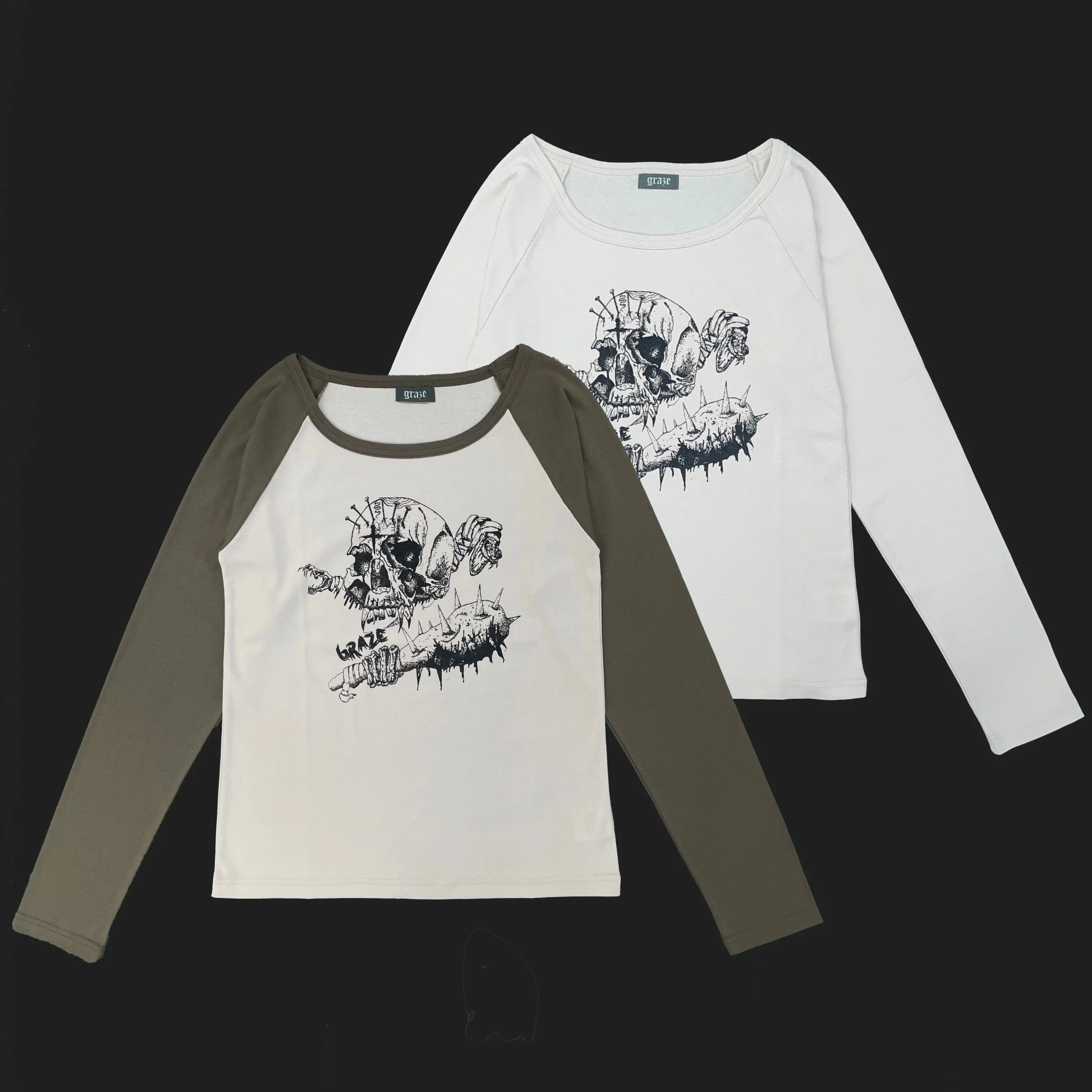 イチオシ商品として、ラグランスリーブTシャツを取り扱っている。こちらはシルエットや色にこだわりのある商品でパターンのひけるメンバーが1からパターンを制作し、色味や記事などのセレクトも全てメンバーで行った完全オリジナル商品である。サイズはフリーのワンサイズだが、男女兼用としてきていただけるようにした。全面にあるインパクトのあるスカルのプリントは、細やかなデザインである。プリント方法にもこだわり、グランドイメージと合うように着用すればするほど味が出るようにした。自らブランドを創り上げるという機会は、なかなか学生時代に経験できることではない。そんな経験の中で、どれだけ商品と向き合えるのか。こだわり続けることが出来るか日々過ごしてきた。ついに、11月3日からそのこだわりをお客様の元へ届けられる。