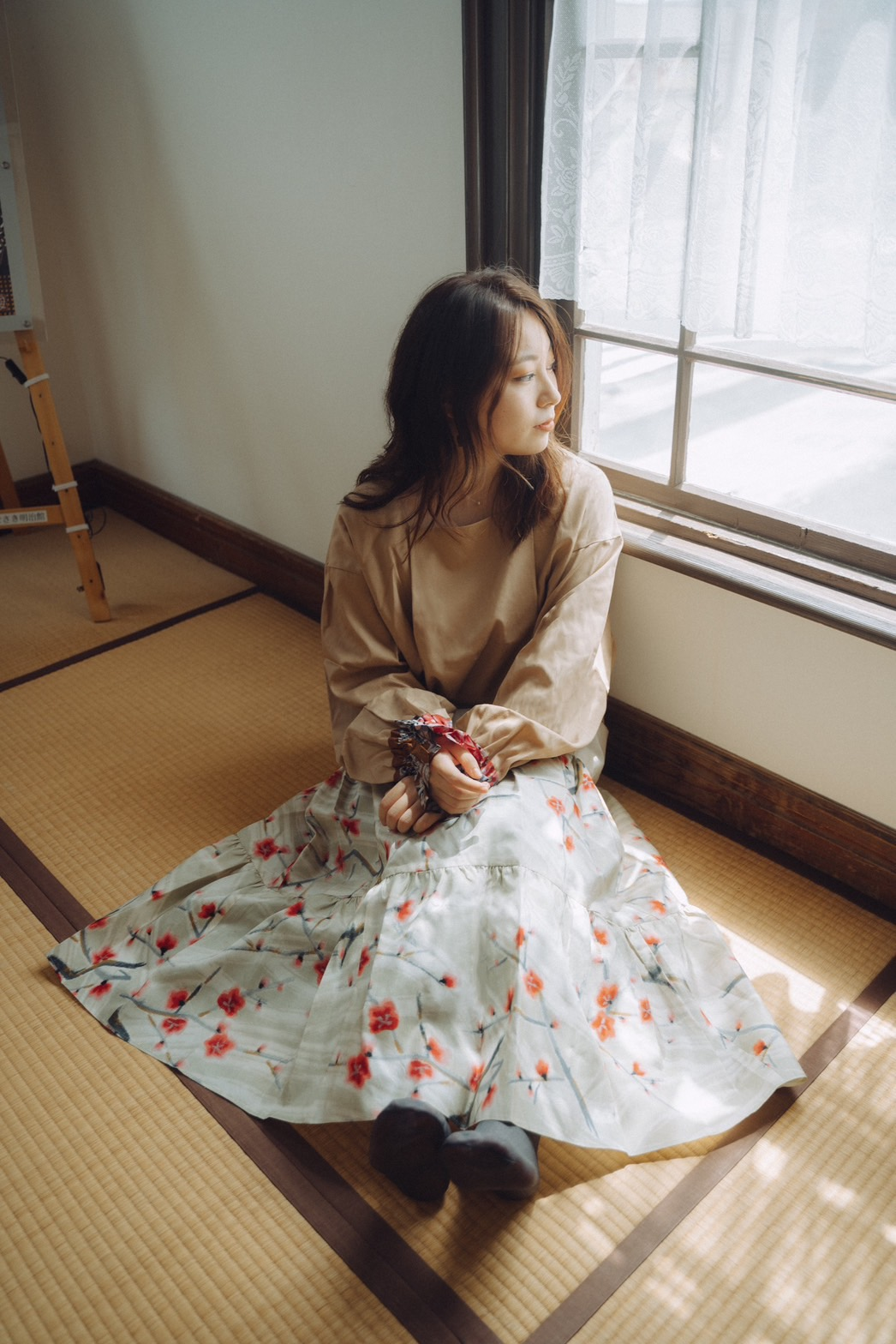 銘仙の鮮やかな色や柄と、役目を終えた白いヨットの帆の軽やかな素材感、