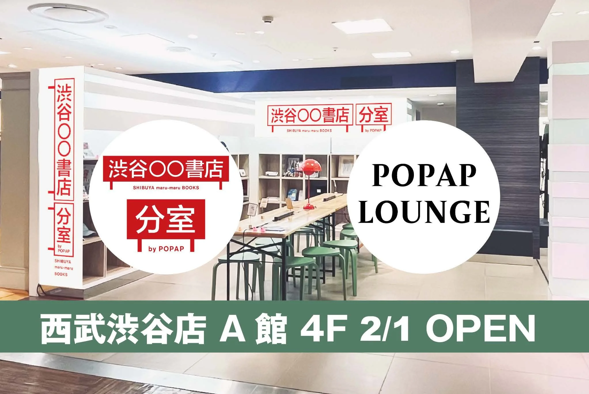 POPAP LOUNGEは西武渋谷店 A館4Fに位置する、『ポップアップ好きが繋がる場』を コンセプトとした会員制のコミュニティラウンジです。会員が利用できる作業スペース 「POPAP DESK」、撮影/配信/イベントに利用が可能な「POPAP STUDIO」、誰でもポップアップ出店が可能な「POP-UP STATION」、一棚単位で出店が可能なコミュニティ書店「渋谷〇〇書店 分室」を備えています。