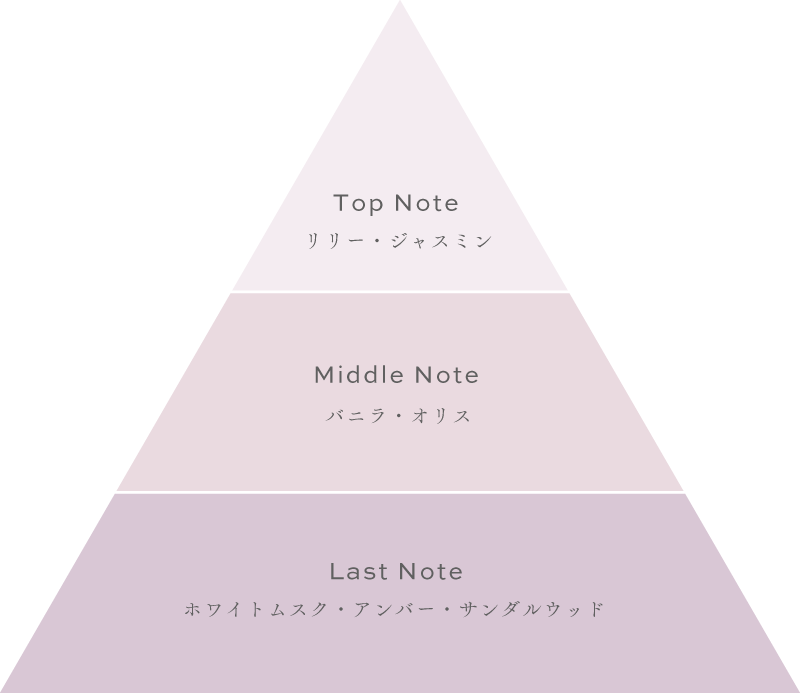 柔らかく上品なジャスミンの香りに始まり、甘過ぎずさっぱりとした優しいバニラの香りに。ラストノートに近づくにつれ、サンダルウッドの気品のある香りへと移り変わります。