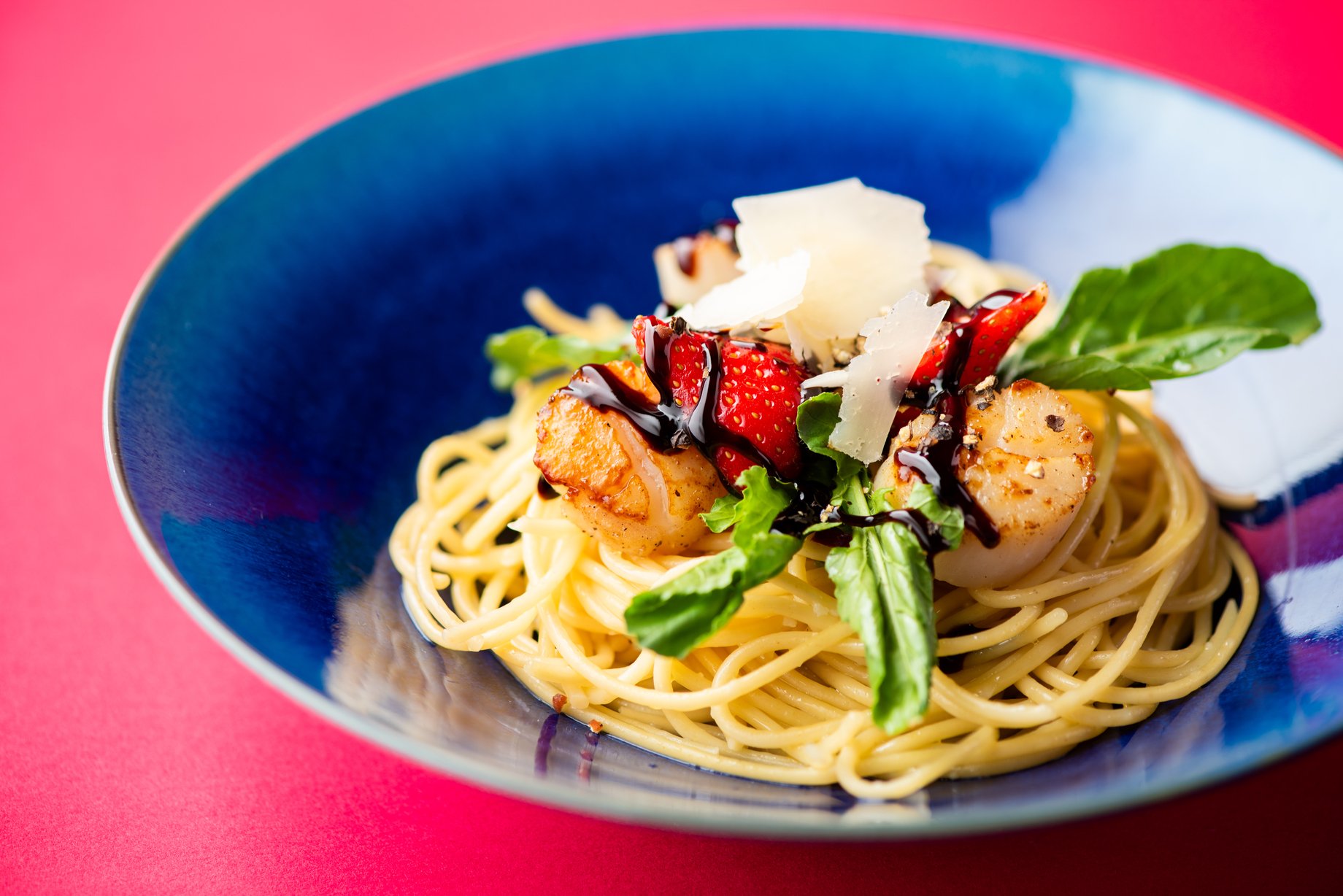 噴火湾の帆立貝とカナデルベリーの苺のペペロンチーノ