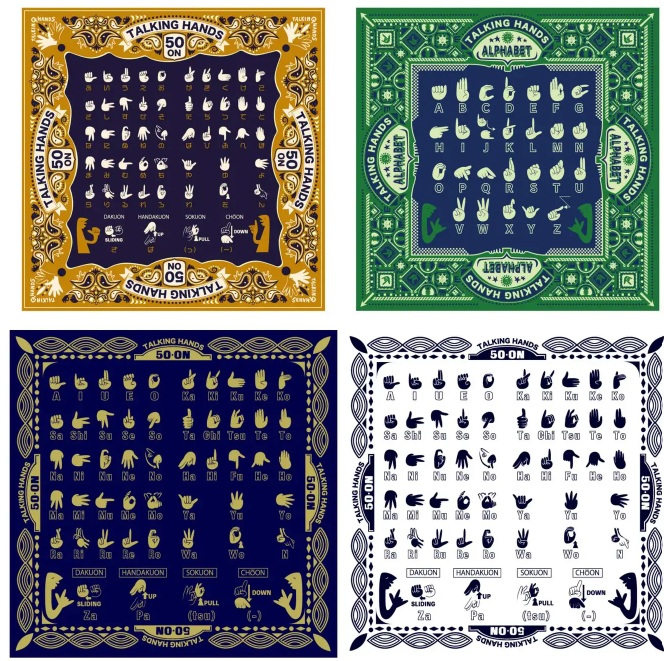 飾っても楽しいおしゃれな50音の指文字デザインのハンカチやバンダナ。