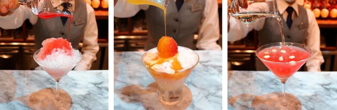 ②シュワシャリソーダ氷…人気NO.1カクテルのThe CHOYAソニックに使用するトニックソーダを凍らせた、ちょっぴりビターで柑橘系の香りの詰まった甘酸っぱさが特徴。