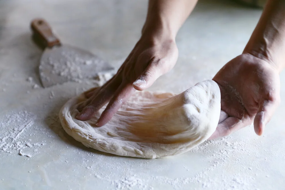 ピザ生地は、工房で職人が気温や湿度によって配合を微調整して作ります。ふっくらと発酵した生地を一枚一枚職人が手伸ばしで形成。手間がかかりますが、実直な工程がおいしさに結びつきます。
