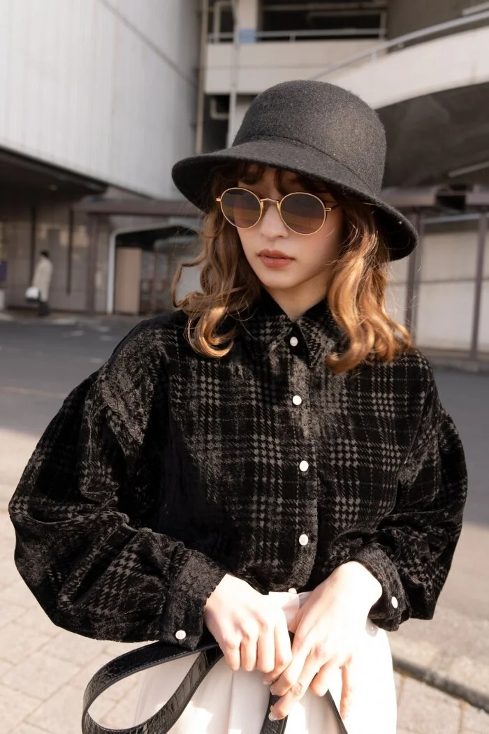 シースルーチェック柄ブラウス。よく見るとチェック柄の一部が千鳥格子になっています。