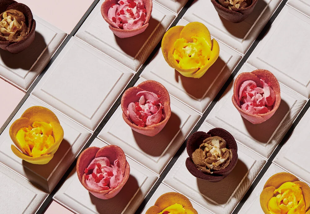 繊細なラングドシャクッキー細工のチューリップの中に、とろけるホイップショコラのローズを咲かせました。ブランドで最も愛されている、金井理仁の代表作です。甘酸っぱい「ベリー」、深みある「キャラメルナッツ」、爽やかな「パッションマンゴー」の3味のセット。