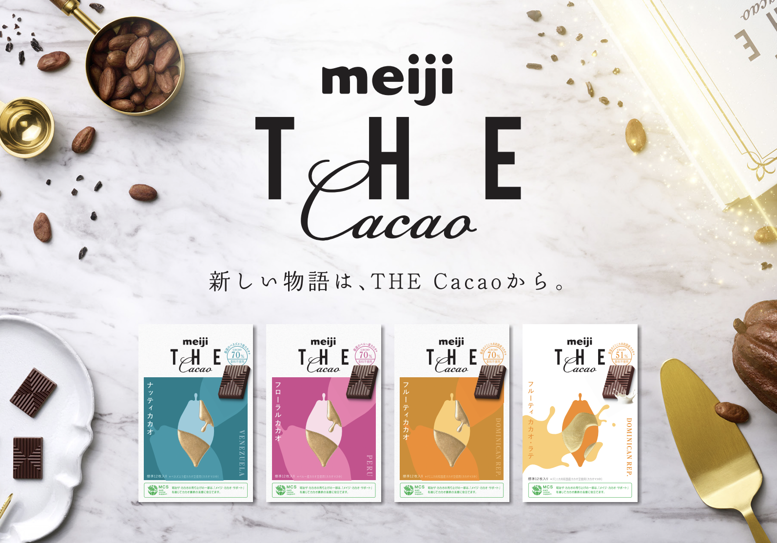 「明治 ザ・カカオ」は、明治独自のカカオ農家支援活動「メイジ・カカオ・サポート」を実施した地域のカカオ豆を使用し、カカオの産地から製法まですべてにこだわった、明治にしか引き出せない、カカオ本来の香味を活かした香料不使用のチョコレートです。「明治ザ・カカオ」は、磨き上げてきたカカオの3つの香味を軸とした4つのラインナップ。ナッティな香りのベネズエラ産カカオ豆を使用した「ナッティカカオ」、フローラルな香りのペルー産カカオ豆を使用し「フローラルカカオ」、フルーティな香りのドミニカ共和国産のカカオ豆を使用した「フルーティカカオ」、そしてフルーティカカオをベースにミルクを合わせた「フルーティカカオ・ラテ」。