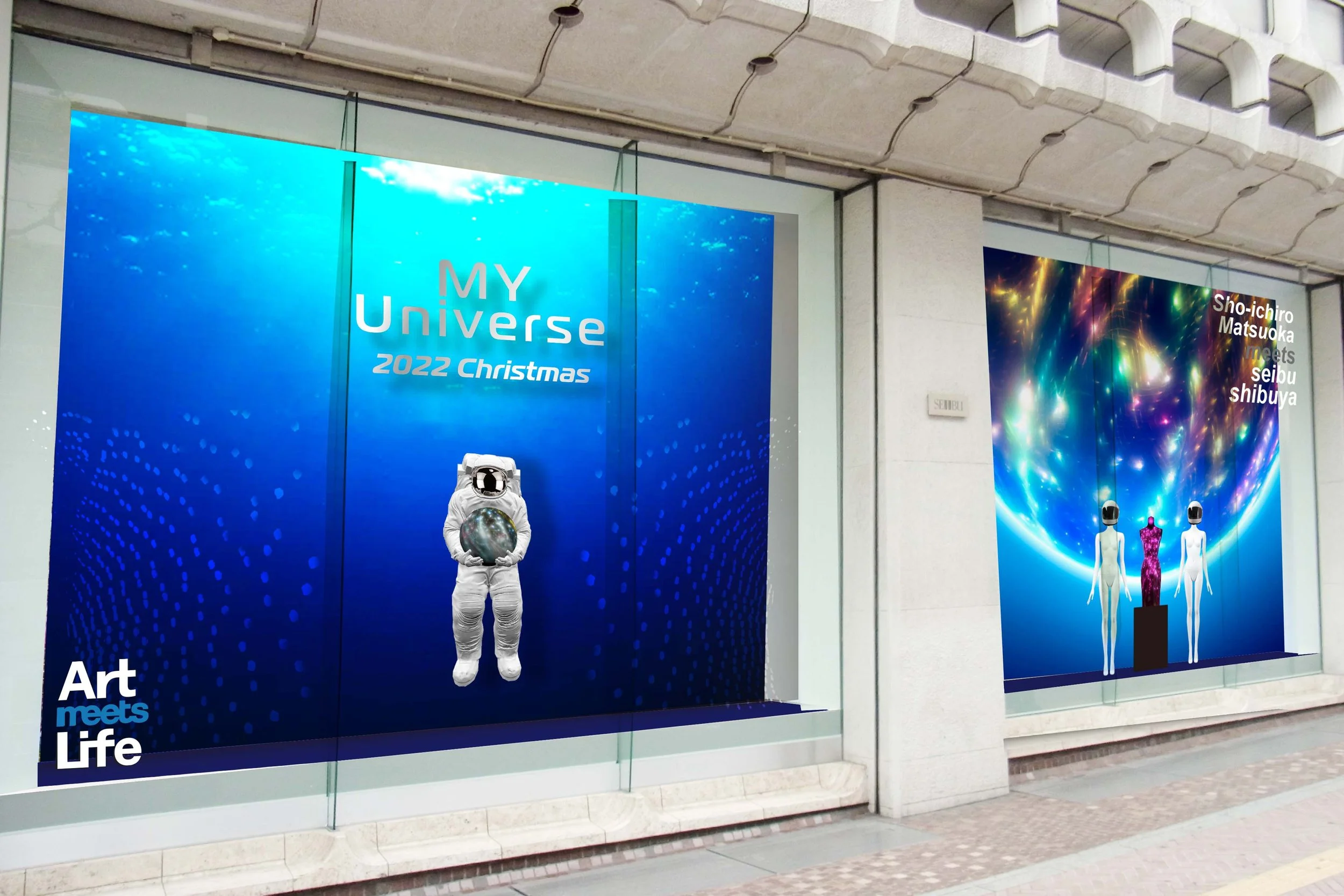 2022年のクリスマスは「MY UNIVERSE」をテーマに、特殊メイクの技術を主軸にあらゆるジャンルで活躍する特殊メイクアップアーティスト松岡象一郎とコラボレーションいたします。幻想的な光を放つ光ファイバーオブジェの数々が館内各所に登場。京都の西陣織で編み込まれた光ファイバーをシリコン造形物に使用した作品は他の追随を許さない独自の世界観で、光が織りなすアーティスティックなクリスマスを演出いたします。 A館1階ショーウインドーでは「未来からの贈り物」を表現。アストロノーツが抱える球体オブジェは、未知なる生命体のような神秘的な光の反射と拡散で、昼夜問わず楽しめるように彩られます。また、12月8日(水)~25日(日)までは、B館8階美術画廊・オルタナティブスペースにて個展「WAVE」を開催。西武渋谷店では11年振りとなる本展では、新作10点を展示いたします。