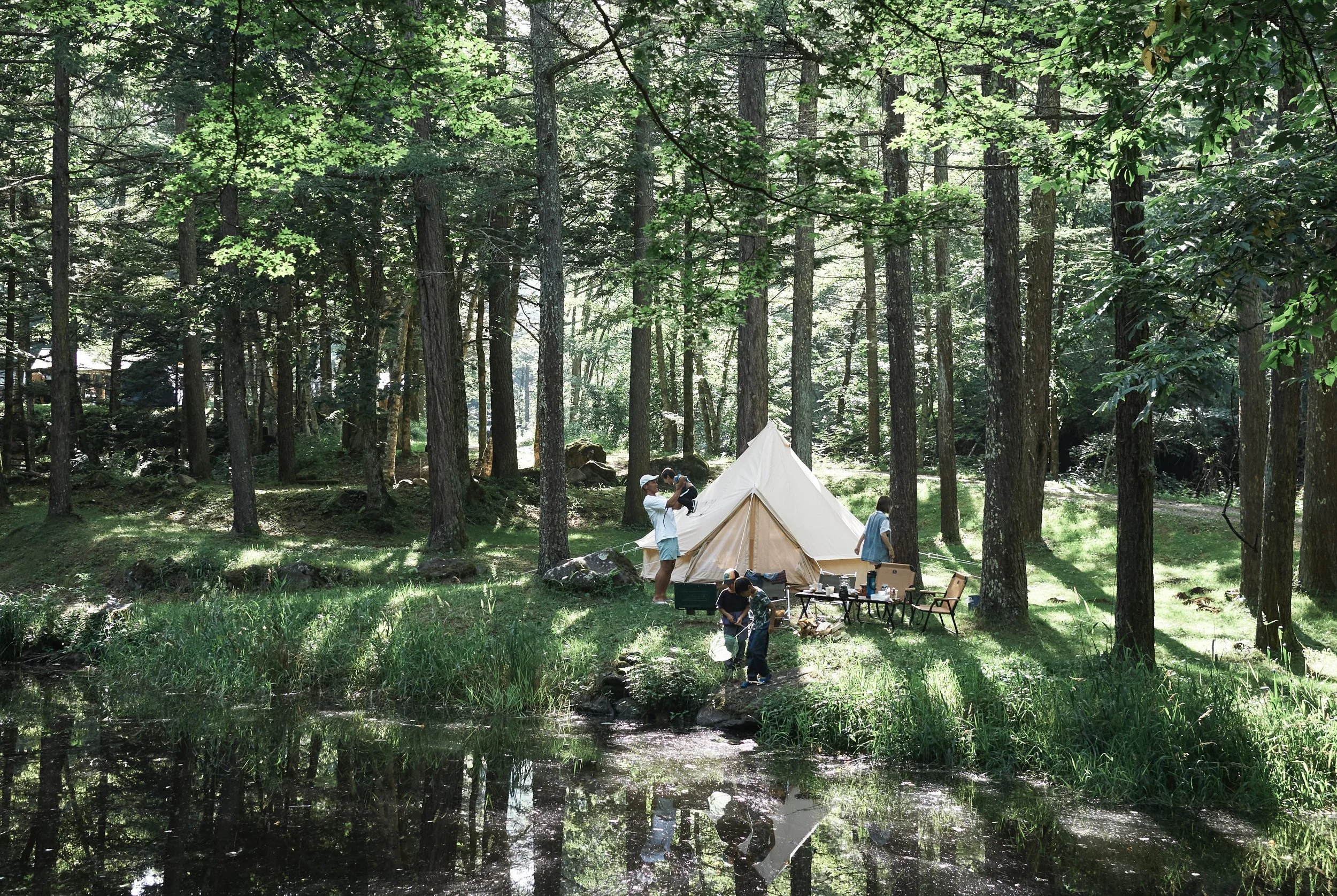 広大な土地のなかに、林間、川沿い、広場、池の畔、線路沿い、直火可能なサイトなど、8エリアの多様な個性を持つキャンプサイトが点在しています。場所によって景色が違うのはもちろん、楽しみ方に合わせて、自由にお選びいただけます。