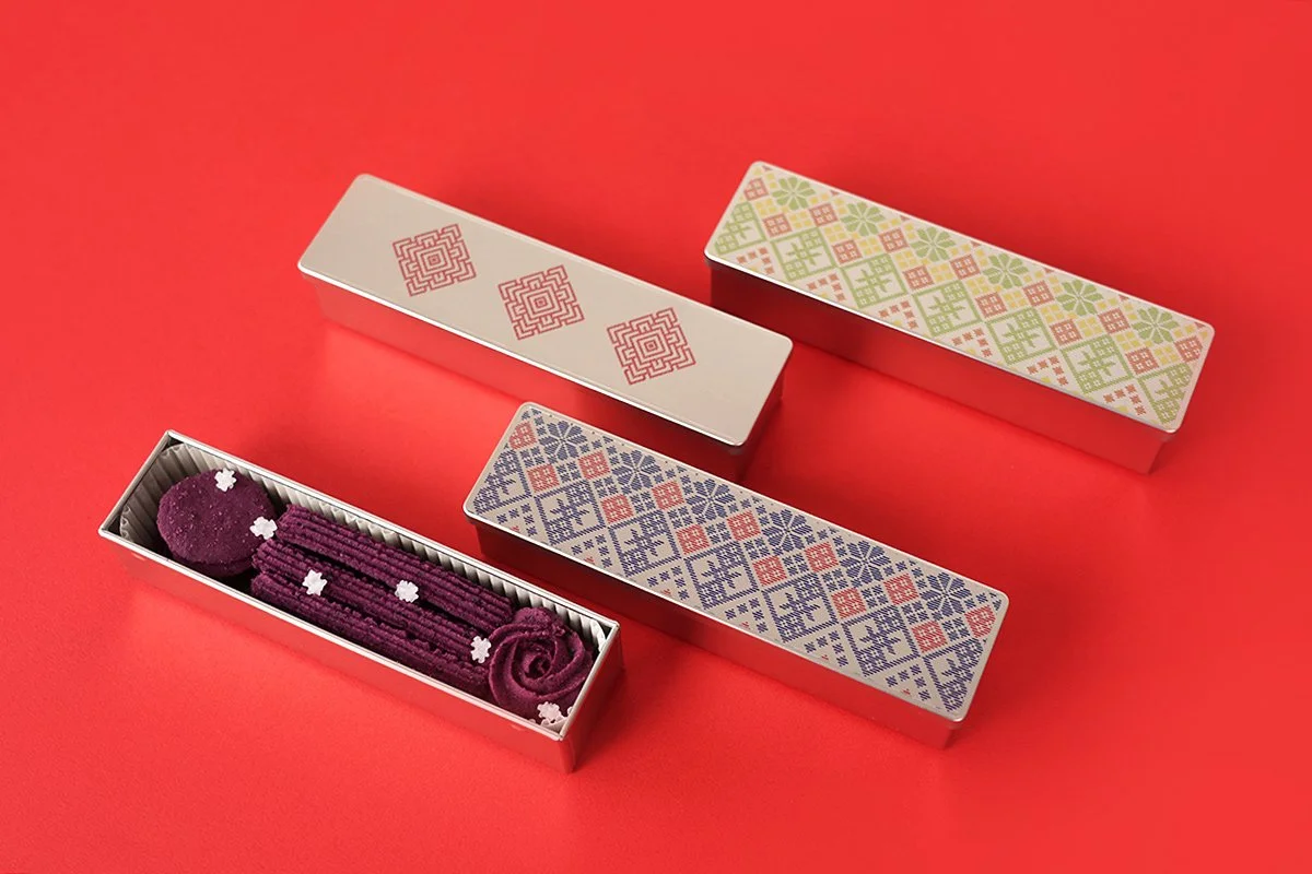 日本一のカシス生産量を誇る青森で生まれた「Cassis cookie + konpeitou」は、カシスをたっぷり使用した贅沢なクッキー&金平糖。缶ケースは青森伝統のこぎん刺し模様を施した美しいデザインで、様々な柄の中からお選びいただけます。ブランデー金平糖が入ったクリスマス限定缶も販売予定。