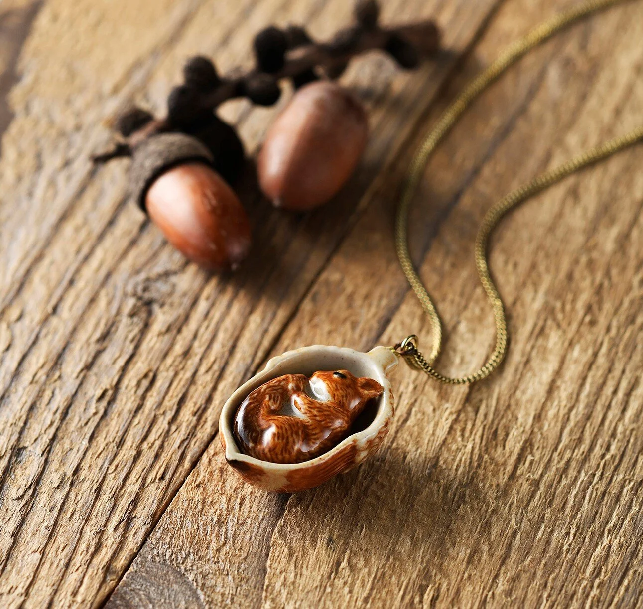 スコットランドでデザイナー自らがハンドペインティングで仕上げている、陶磁製のアクセサリー。どんぐりと、どんぐりの中に入ったリス、両面で使えるなんともキュートなリバーシブルデザインのネックレスです。