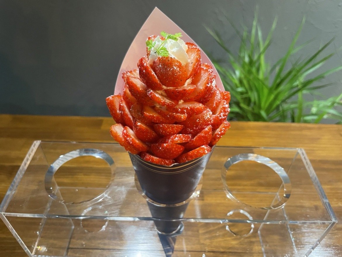 まずはメインとなるいちごを、日替わりで厳選した4種類以上の産地・品種から選びます。続いて、トッピングとして複数種類のクリーム・ソース・アイス・ケーキ等から好きな組み合わせを選び、自分好みのクレープが完成です。「全国いちご会議」の県産いちごも数量限定で登場。気になるいちごがあれば個数を追加して食べ比べるのもおすすめです。自分好みの全国各地のいちごと出会い、自分好みにカスタマイズしたクレープをオーダーできるワクワク感をぜひお楽しみください。