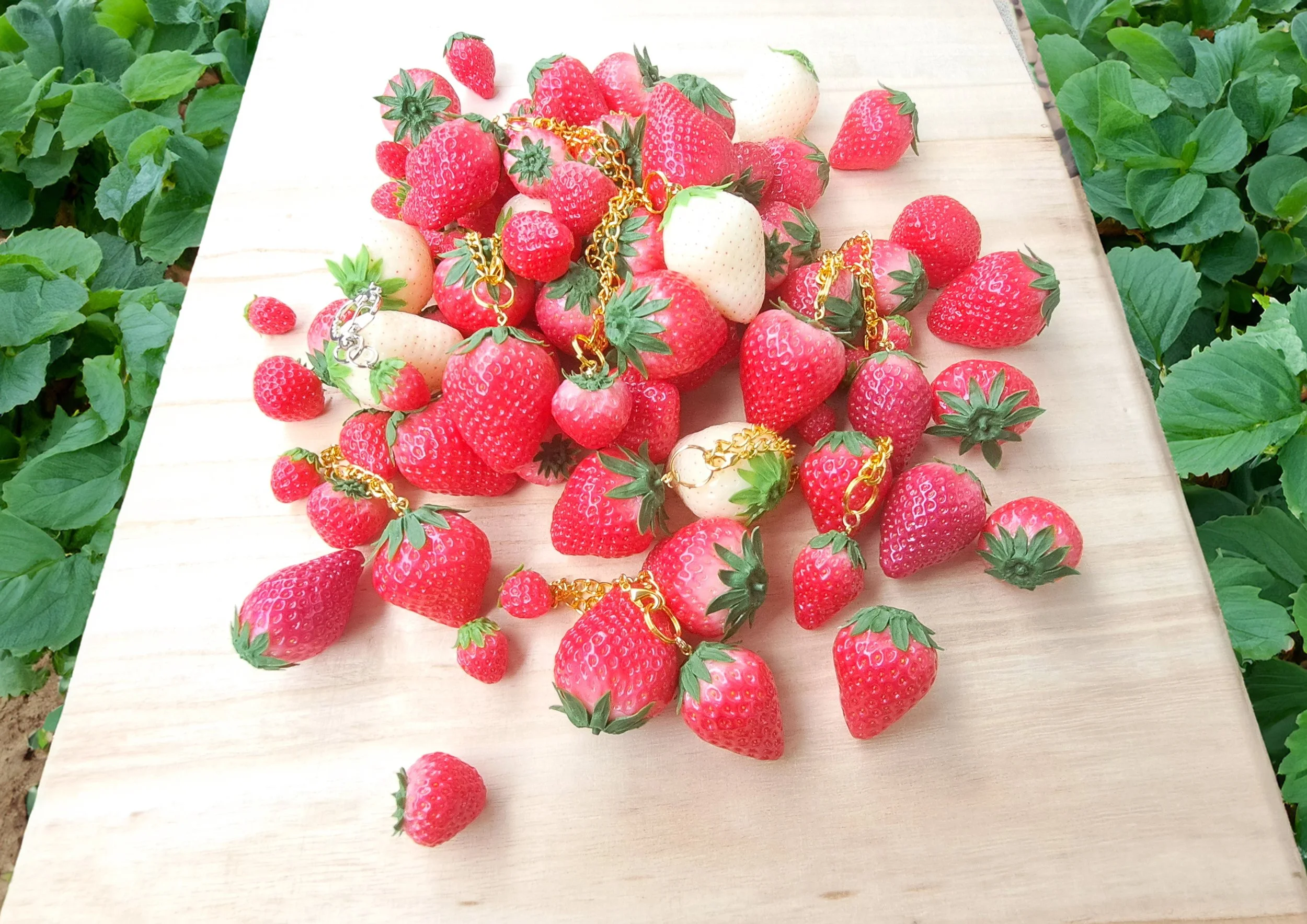 全国の色々な苺の品種をリアルに再現しバッグチェーンに仕立てました。本年は「食べられないミルキーベリー」と「食べられない信大BS8-9」が新登場し11品種に増えました。