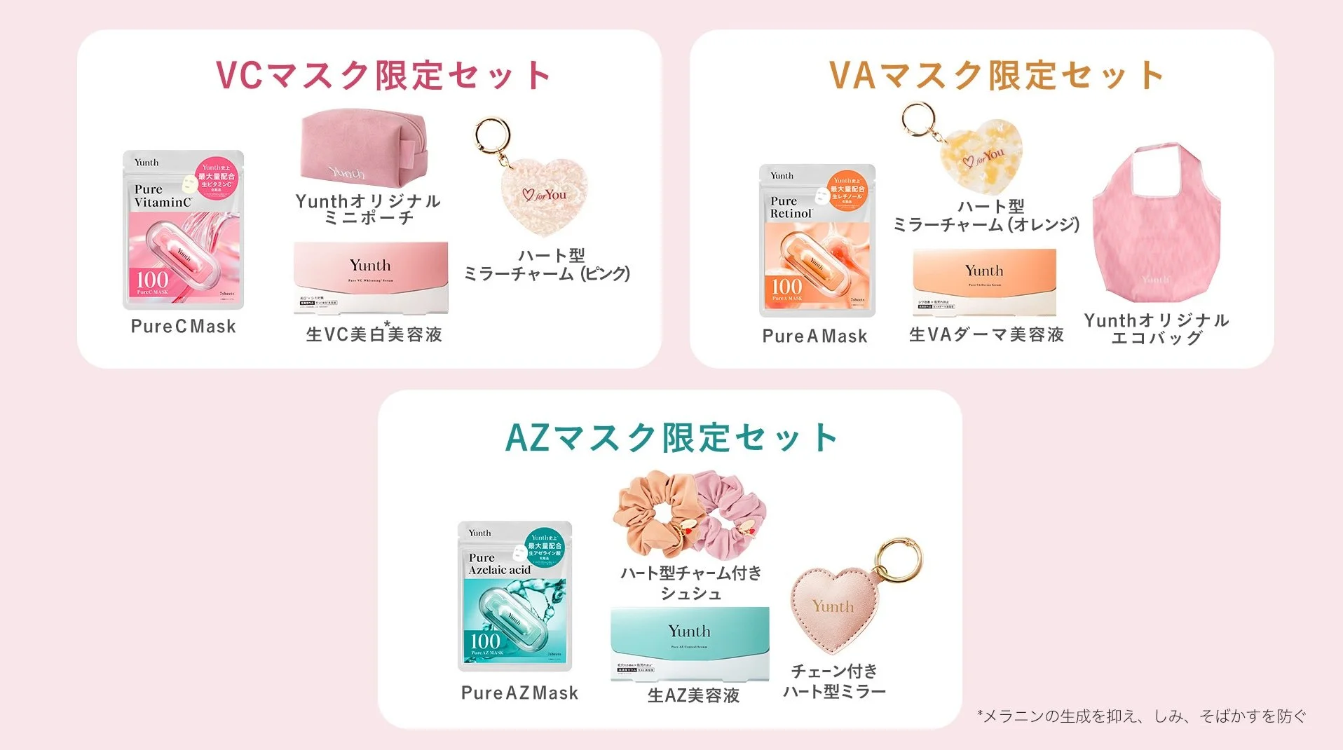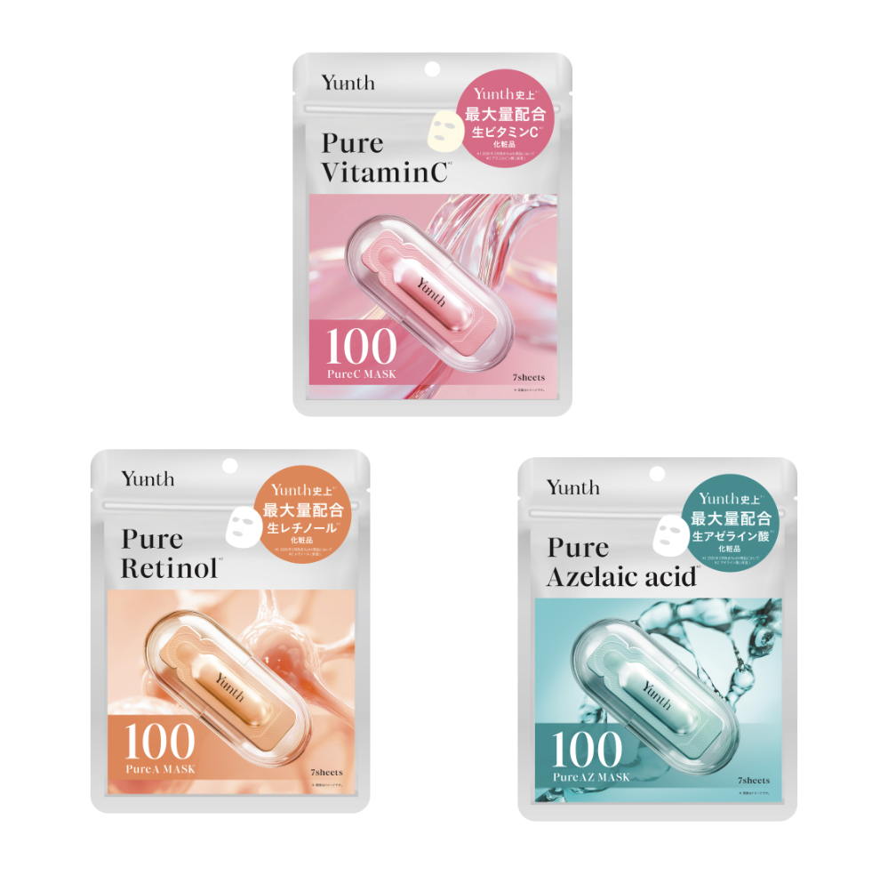 Yunthブランド史上最大量*の美容成分を配合したシートマスクシリーズ。全3種のラインナップで、肌悩みに合わせた集中ケアをデイリーに提案します。