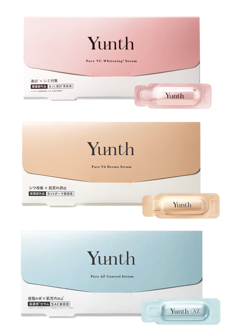 * 2026年3月時点Yunth商品におけるそれぞれの成分(アスコルビン酸、レチノール、アゼライン酸)において